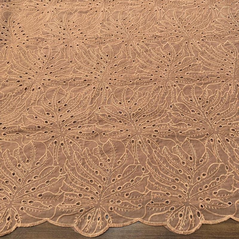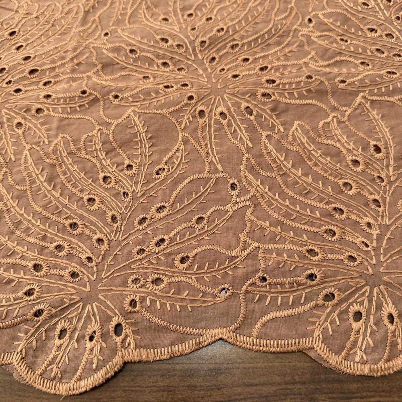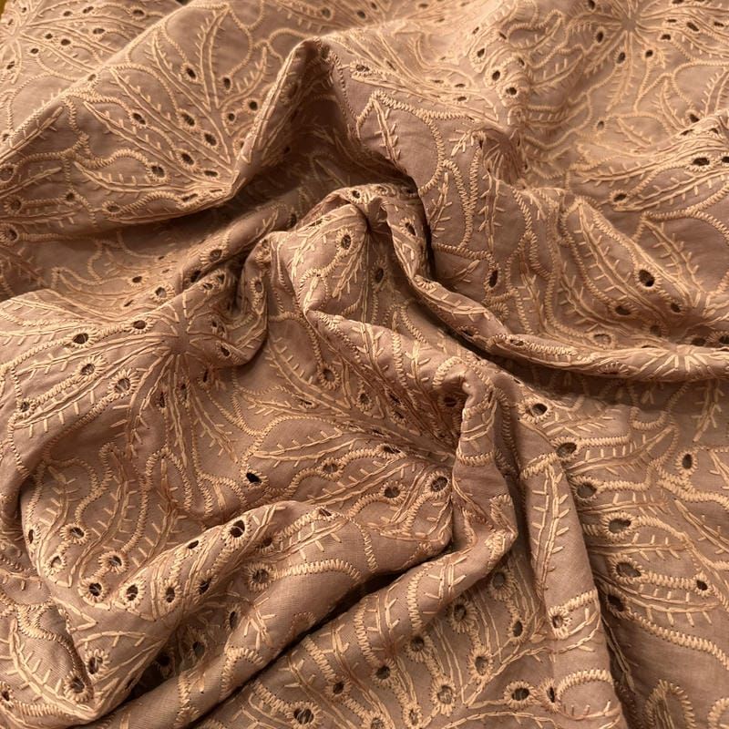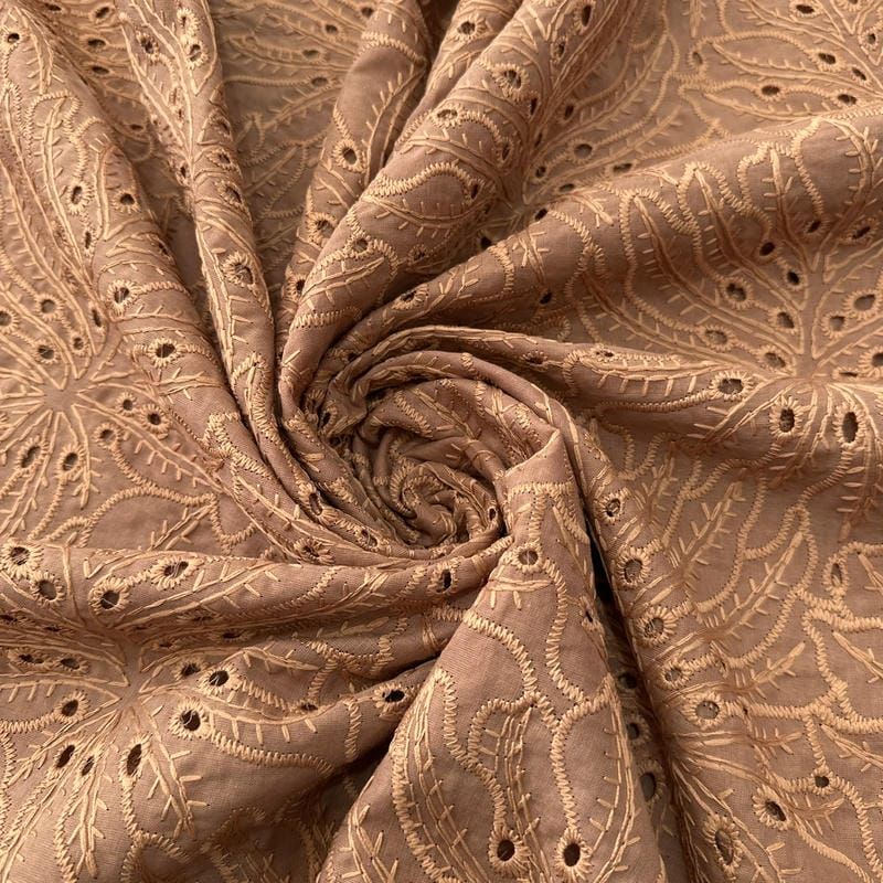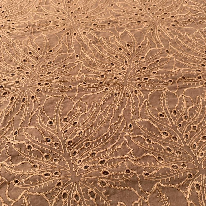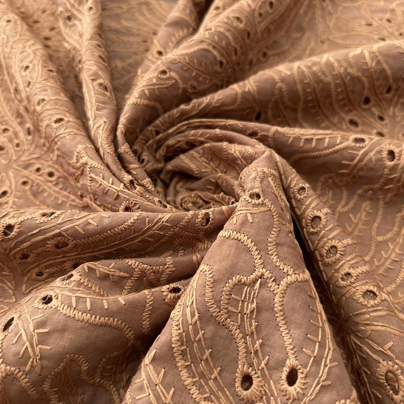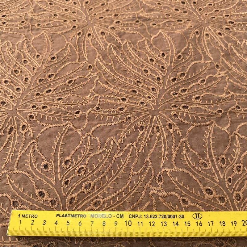 Tecido Laise de algodão Bordada Bege Escuro Terroso: leve, delicado e ideal para peças elegantes e femininas.