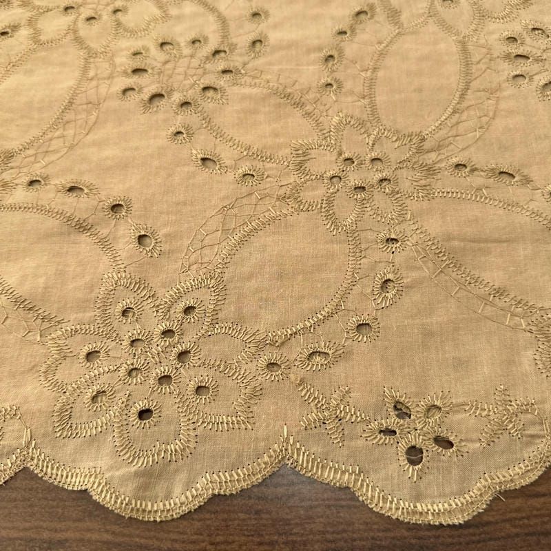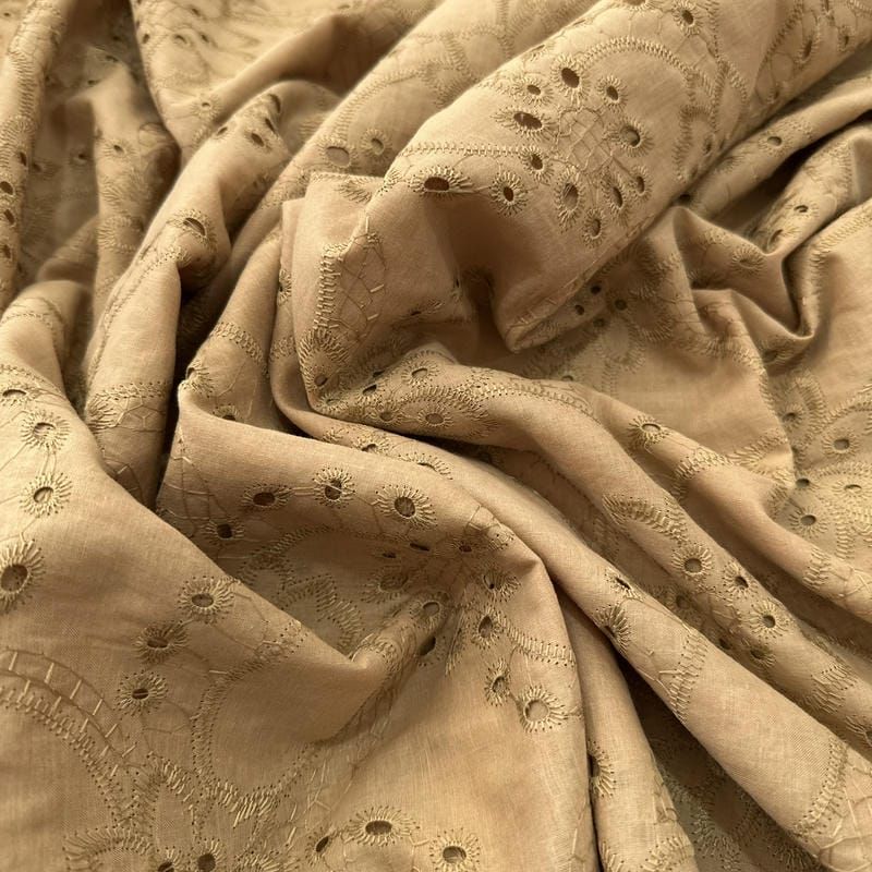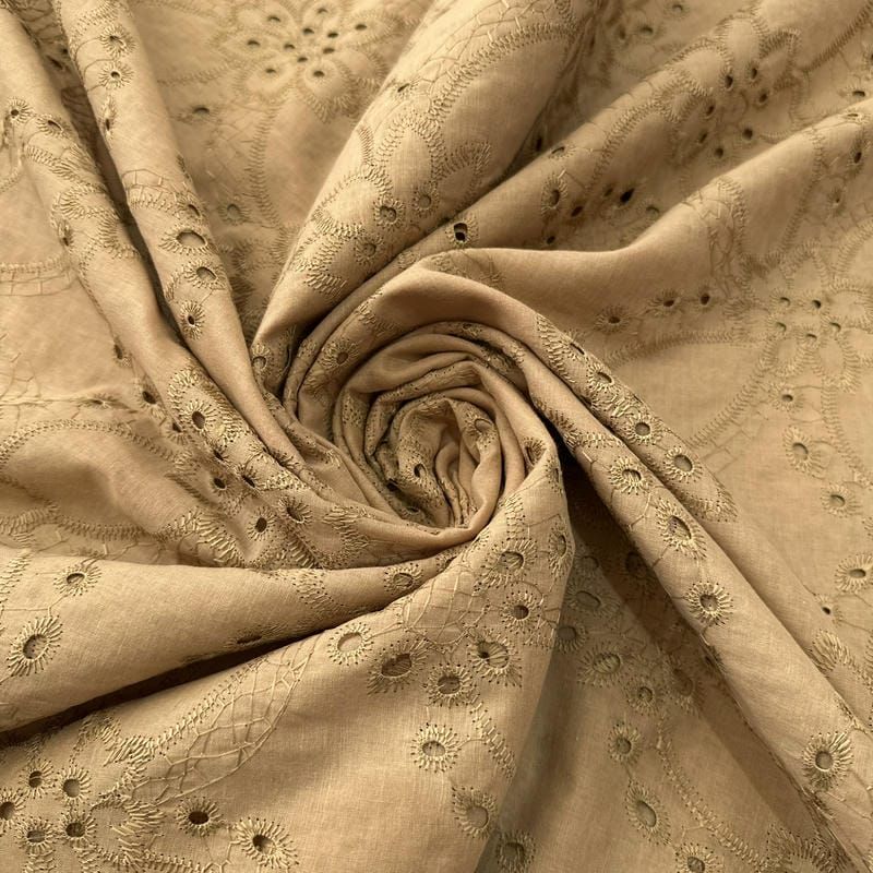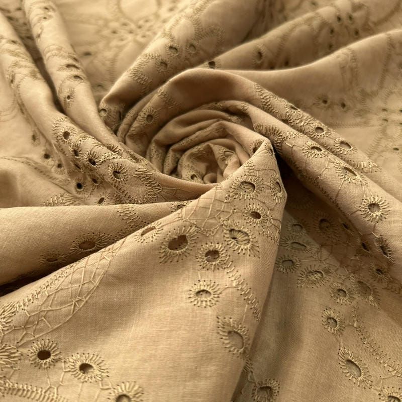 Tecido Laise de algodão Bordada Cáqui Ouro Velho: leve, delicado e ideal para peças elegantes e femininas.