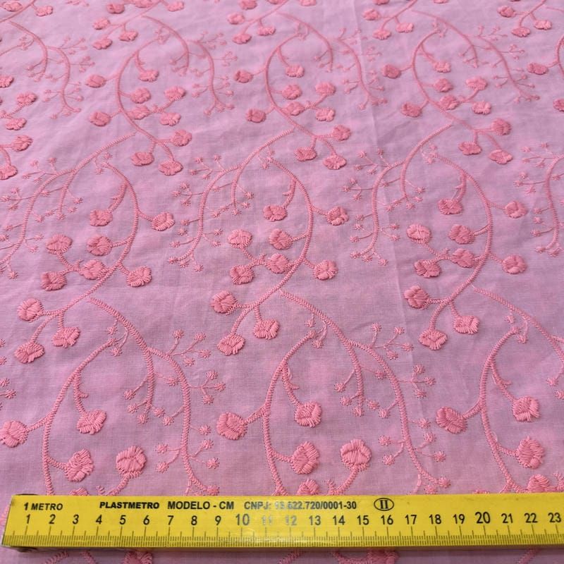 Tecido Laise de algodão Bordada Rosa: leve, delicado e ideal para peças elegantes e femininas.