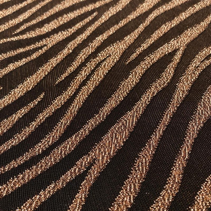 Tecido Malha Lurex Zebra Dourado Fundo Preto: brilhante, elástico e ideal para peças modernas e elegantes.