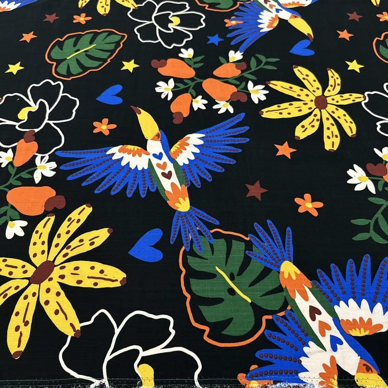 Escolha seu Tecido Viscolinho Estampado Araras Pop Art e transforme suas ideias em roupas leves, cheias de estilo e conforto!