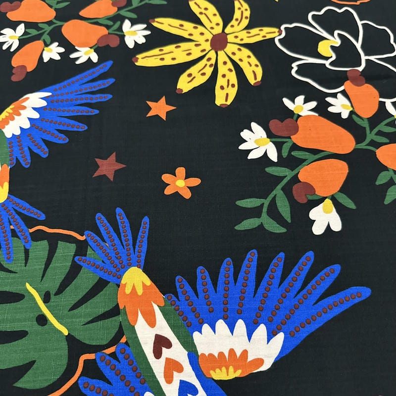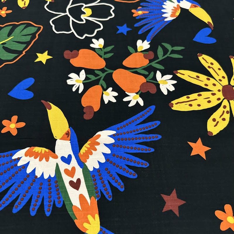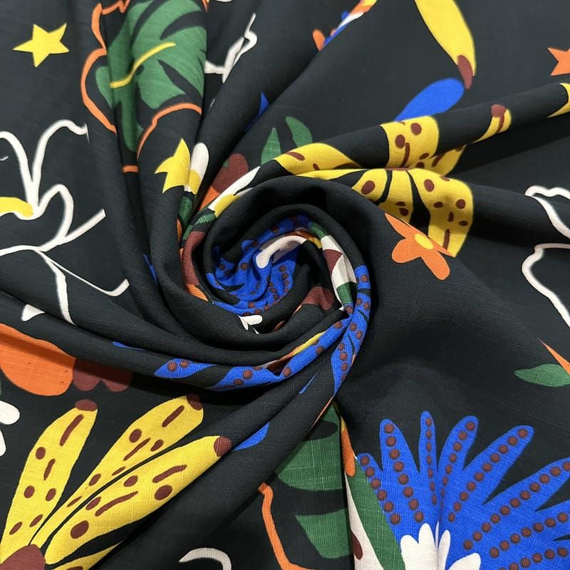Tecido Viscolinho Estampado Araras Pop Art: leve, macio e perfeito para roupas confortáveis e estilosas.