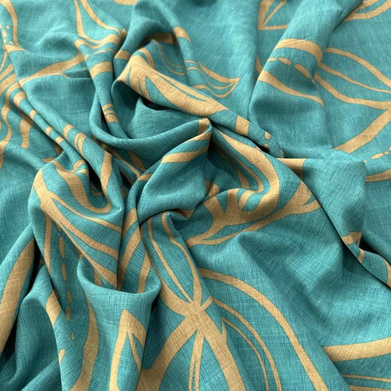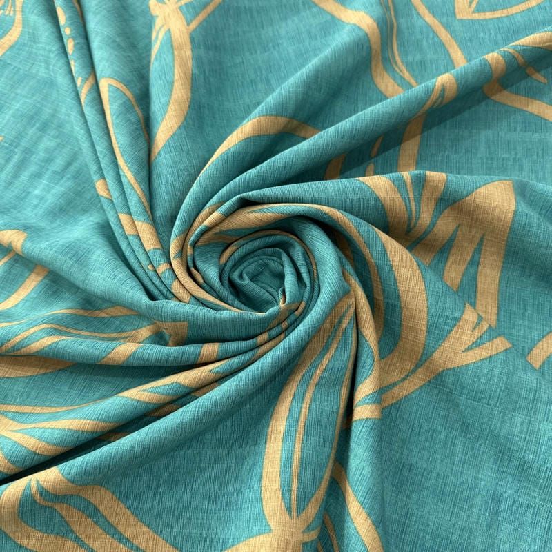Tecido Viscolinho Estampado Folhagem Mar Turquesa: leve, macio e perfeito para roupas confortáveis e estilosas.