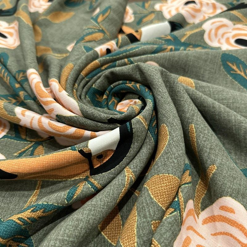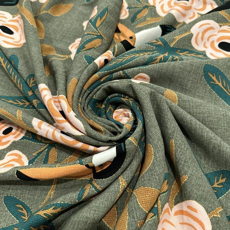 Tecido Viscolinho Estampado Jardins do Tucano: leve, macio e perfeito para roupas confortáveis e estilosas.