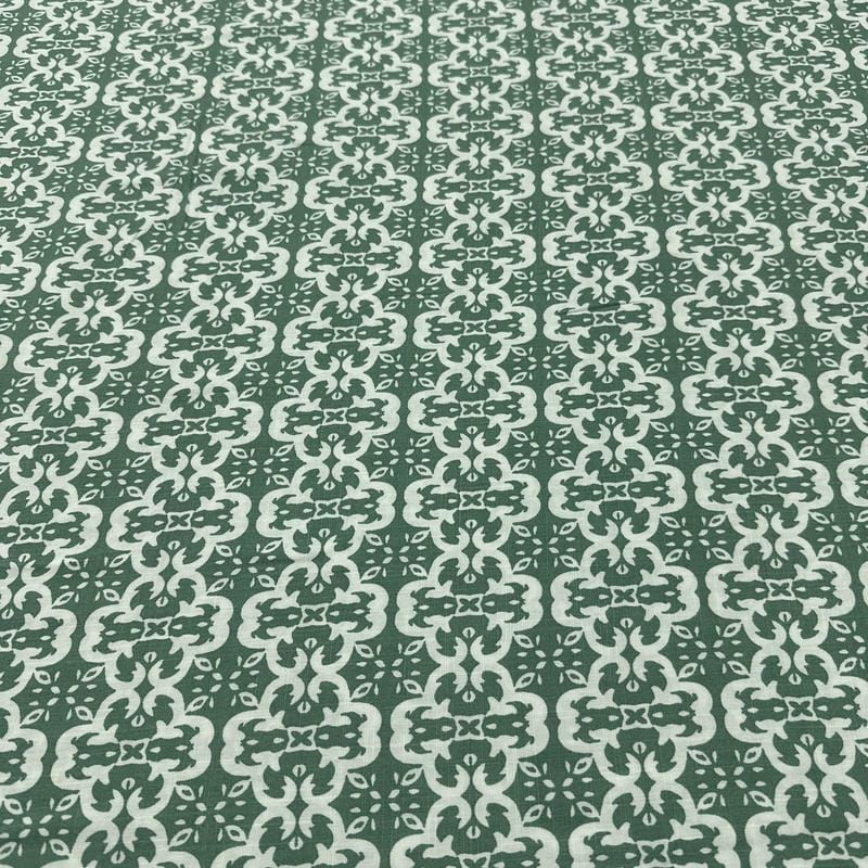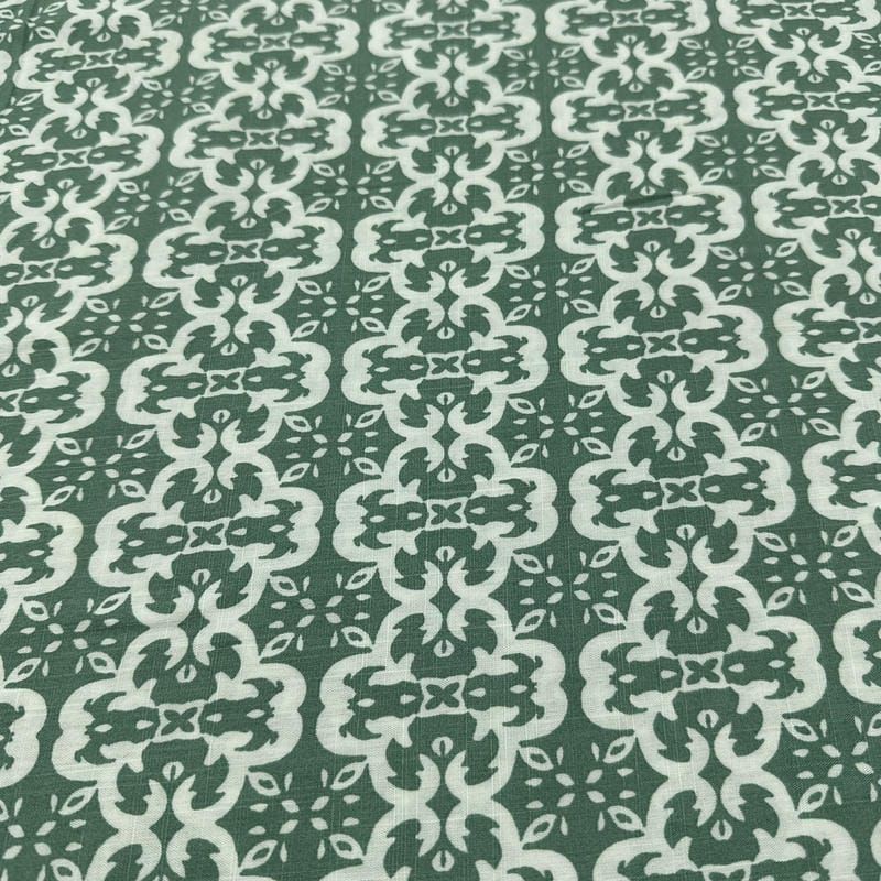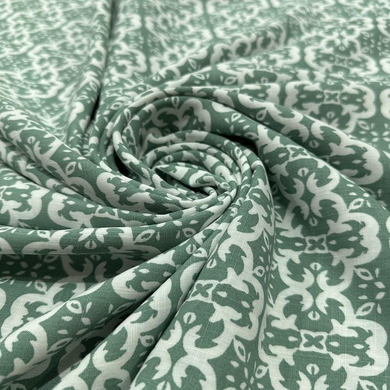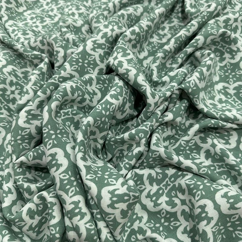 Tecido Viscolinho Estampado Mourisco Sálvia: leve, macio e perfeito para roupas confortáveis e estilosas.